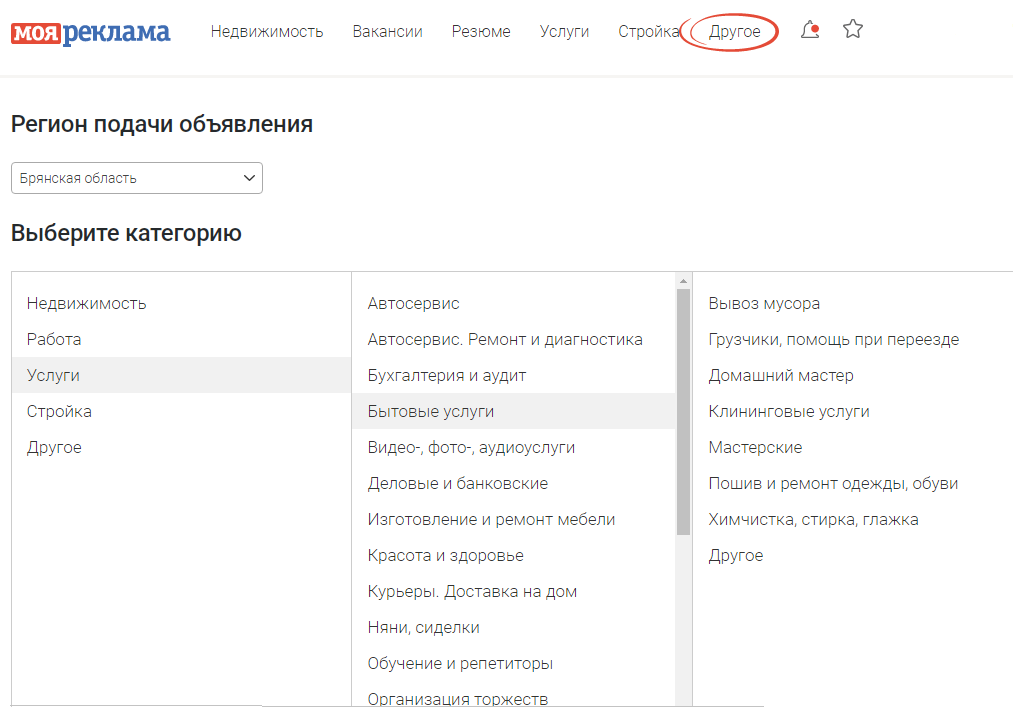 Начните подачу объявления, нажав кнопку "Подать объявление" – находится в левом верхнем углу сайта. Выберите раздел, рубрику, подрубрику. Заполните форму.