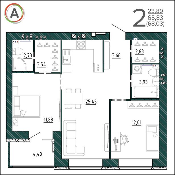 Общая площадь:68 м²