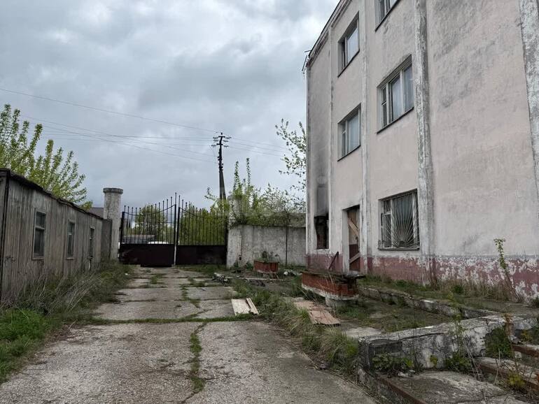 Въезд и площадка перед основным зданием выложена бетонными плитами.
