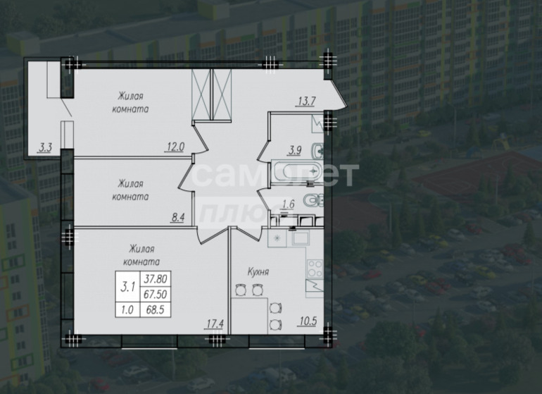 Общая площадь:68,5 м²