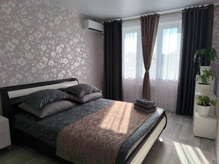 Спальня объединена с прихожей арочным проемом и оборудована белоснежным спальным гарнитуром с изящными золотыми ручками ДОЛЬЧЕ от АНГСТРЕМ. Постельное белье сатин-жаккард и бархатные шторы цвета венге в сочетании с теплым спокойным коричневым окутывают вас уютом. И конечно же "фишка" апартаментов ОЛИВИЯ - живые цветы.