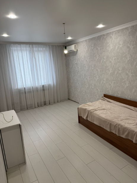 В комнате: натяжные полотки, на полу ламинат, поклеяны новые обои, окно ПВХ, новый радиатор отопления.