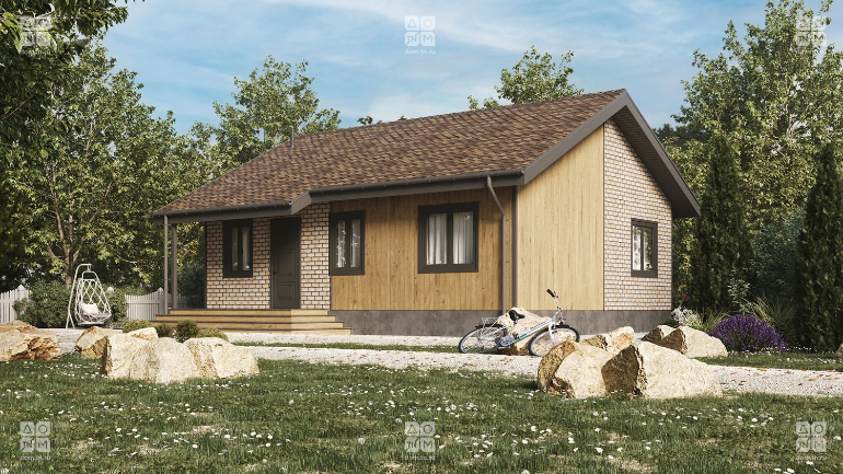 Уютный одноэтажный дом общей площадью 71 м? с двускатной крышей. В доме предполагаются две спальни, просторная гостиная. В вашем доме будет все необходимое: гостиная - кухня, две спальни, ванная, котельная, прихожая.