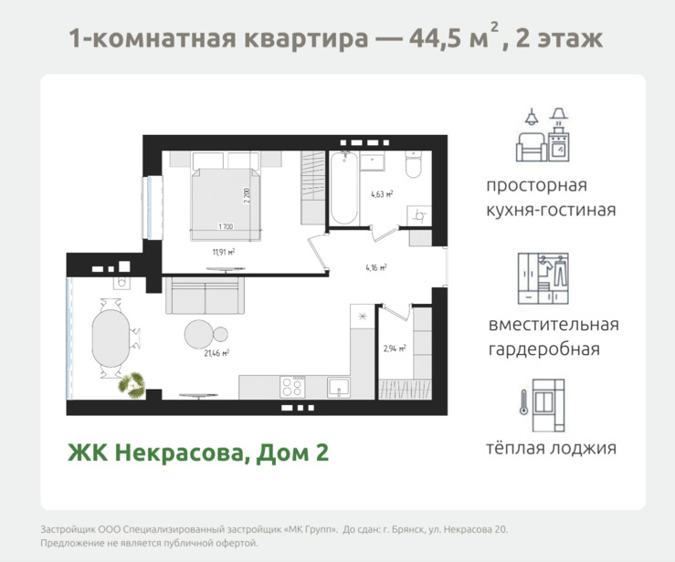 Общая площадь:44,5 м²