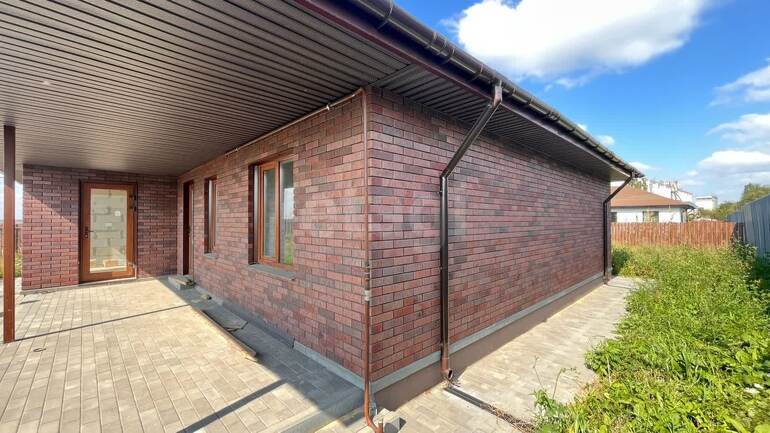 - Стены газосиликат Hebel 300, облицовка фактурным керамическим одинарным кирпичом, с перламутровым оттенком, который невероятно красиво играет на солнце; - Кровля - мягкая, утеплена; - Стяжка с демпферной лентой, залита таким образом, что можно отопление сделать радиаторами, можно теплый пол; - Отмостка вокруг дома, выложена брусчаткой; - Терраса под кровлей.