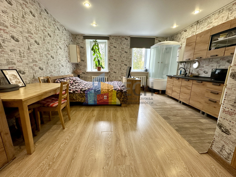Номер в базе: 58257. Продаём большую комнату со всеми коммуникациями, полностью переделанную в квартиру-студию со своими гардеробной, кухонной, душевой и спальной зонами. В квартире всего три комнаты, две из которых принадлежат доброй пожилой паре, которые в дачный сезон (с мая по октябрь) живут на даче. Единственное общее удобство – чистый туалет. Дом толстостенный (70 см) кирпичный. Окна выходят на тихий озелененный чистый двор. Котельная рядом с домом, топит очень хорошо! Комфортный средний этаж, квартира не угловая и не торцевая. Новая медная электропроводка с хорошим запасом мощности, рассчитанным и на весь свет с оборудованием, и бойлер, и на духовой шкаф, и стиральную машину, есть автоматы отключения. Свет в комнате удобно распределен по отдельным зонам и регулируется соответственно. Счетчик свой, все квитанции приходят свои на комнату. Все стеклопакеты заменены на качественные тройные, прекрасная тепло и шумоизоляция. Напольные покрытия ламинат. Комната полностью укомплектована всей необходимой мебелью и техникой. Дверь в комнату хорошая металлическая. В этом году был капитальный ремонт крыши, заменены окна в подъезде, планируется монтаж шлагбаума и на следующий год запланирован ремонт фасада дома. В шаговой доступности есть всё необходимое для комфортной жизни от образовательных учреждений, магазинов, супермаркетов и остановок транспорта до аптек, пунктов маркетплейсов, салонов различных услуг, спортивных учреждений и Кировского сквера. 5-7 минут от дома до центральной части города. Взрослый собственник, прямая продажа, без обременений. Звоните, организуем показ в удобное время.