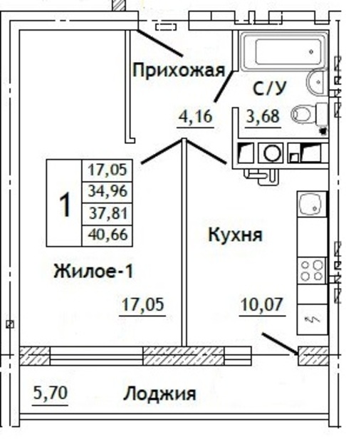 Общая площадь:40,7 м²