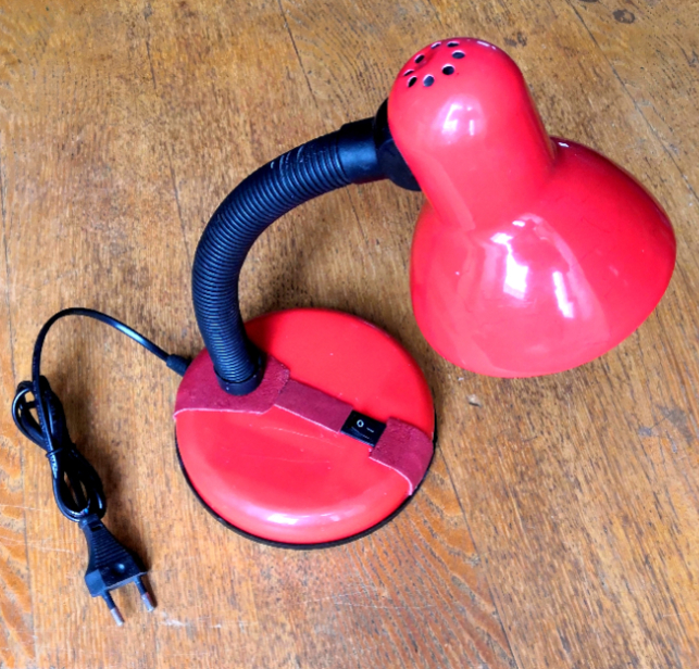 производство Китай, размеры 30х15см, корпус пластиковый, плафон стальной, гибкий держатель, цвет красный, б/у.