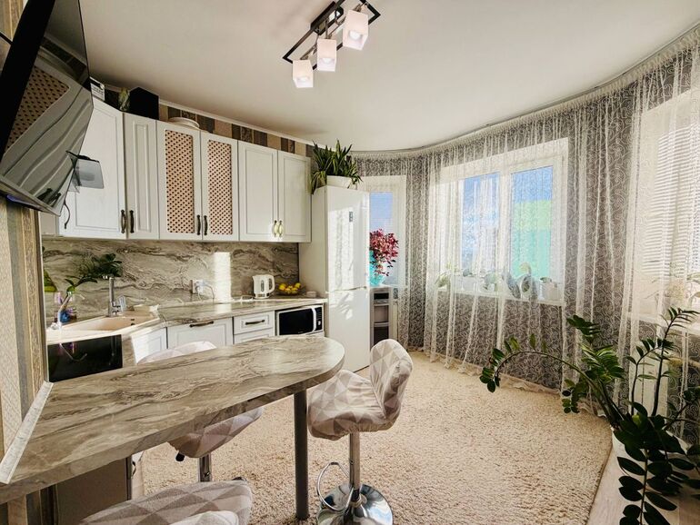 В квартире всё продумано для комфортной жизни - интерьер в приятных тонах, современный кухонный гарнитур, вместительный шкаф-купе и в целом приятная атмосфера.