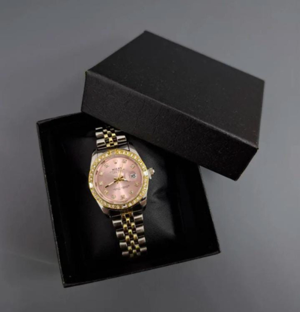 Часы женские, Ролекс, со стразами, розовый циферблат, диаметр 3 см, класс водонепроницаемости 3атм, новый товар.