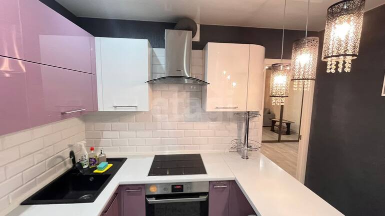 - Кухня с встроенной техникой, такой как варочная поверхность, духовой шкаф с грилем, вытяжка, посудомоечная машина. Также двухкамерный холодильник, микроволновка, электрический чайник, тостер.