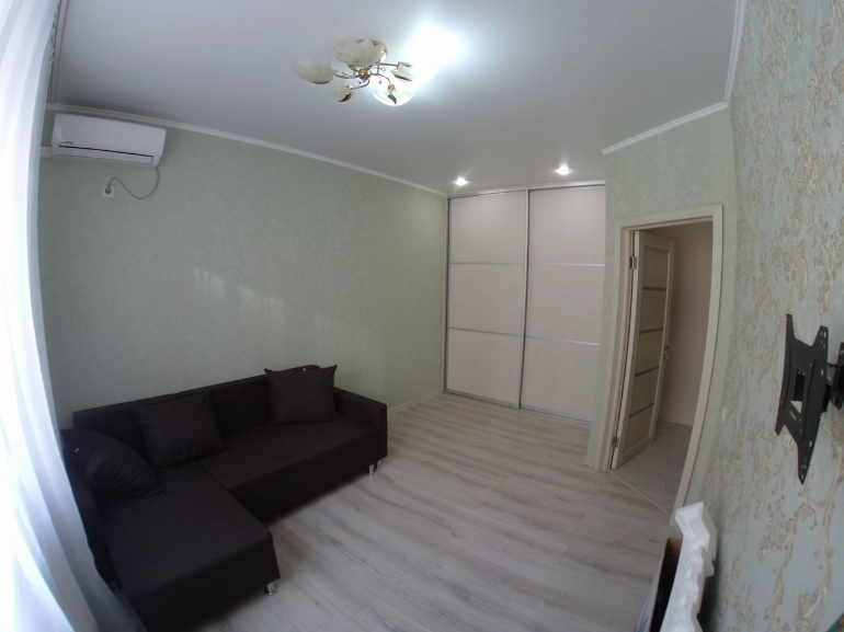 Квартира оборудована кухонным гарнитуром, обеденным столом со стульями, диваном, шкафом для вещей.