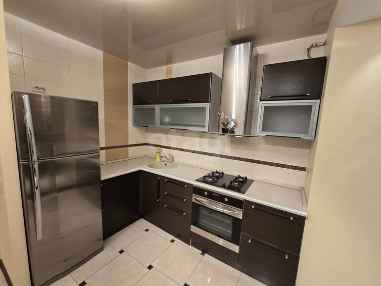 Квартира полностью укомплектована новой мебелью и необходимой бытовой техникой: кухонный гарнитур с духовым шкафом и плитой, холодильник, обеденная группа, кровать, шкаф в спальне и мягкая мебель в гостиной.